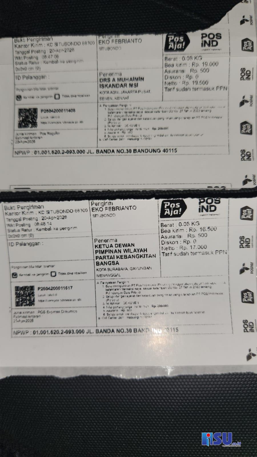Ini Resi Pengiriman Surat laporan Ke DPP PKB Jakarta Dan DPW PKB di Surabaya.