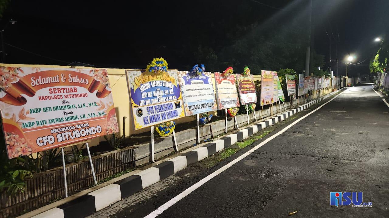 Antusiasme publik terlihat jelas dari suasana di halaman Markas Komando (Mako) Polres Situbondo. Sejak beberapa hari terakhir hingga Minggu malam, puluhan karangan bunga ucapan selamat atas Serah Terima Jabatan (Sertijab) Kapolres Situbondo tampak memenuhi hampir seluruh area Mapolres. Mulai dari gerbang pintu masuk, Lapangan Apel, halaman depan Mako, hingga gerbang pintu keluar Polres Situbondo, berjajar rapi karangan bunga dari beragam pihak.